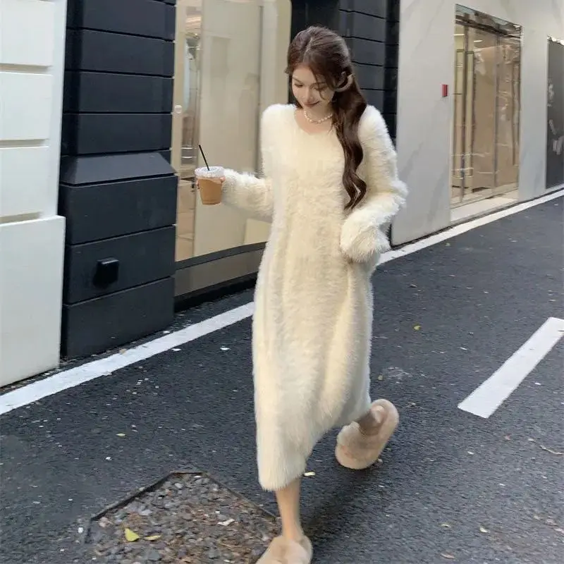 女性用Vネック長袖ニットドレス,女性用Vネック長袖ニットドレス,上質な韓国服,秋冬ファッション