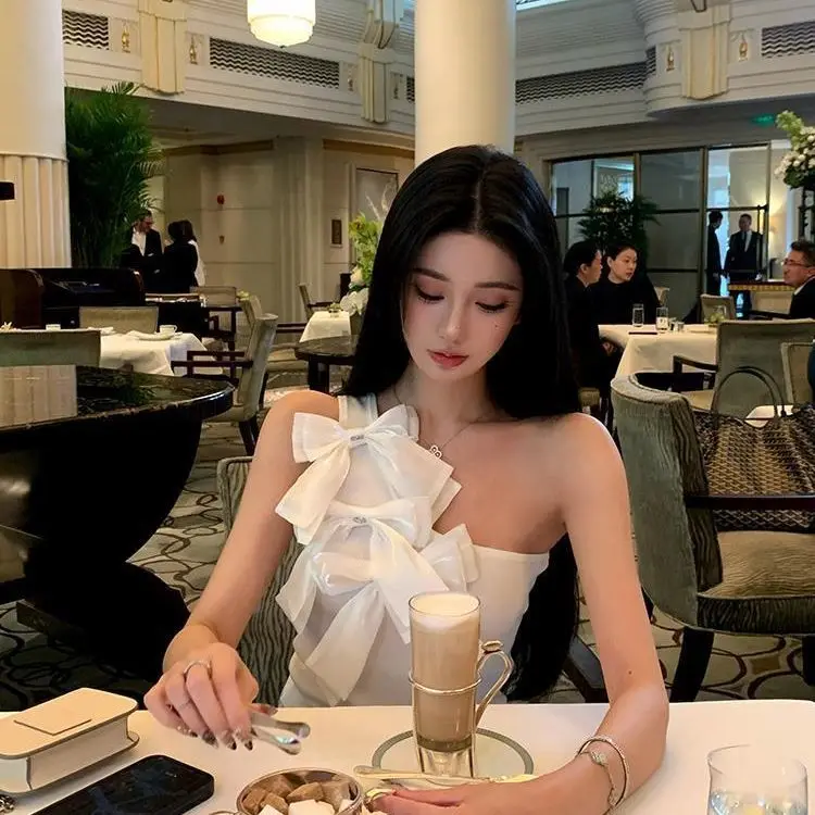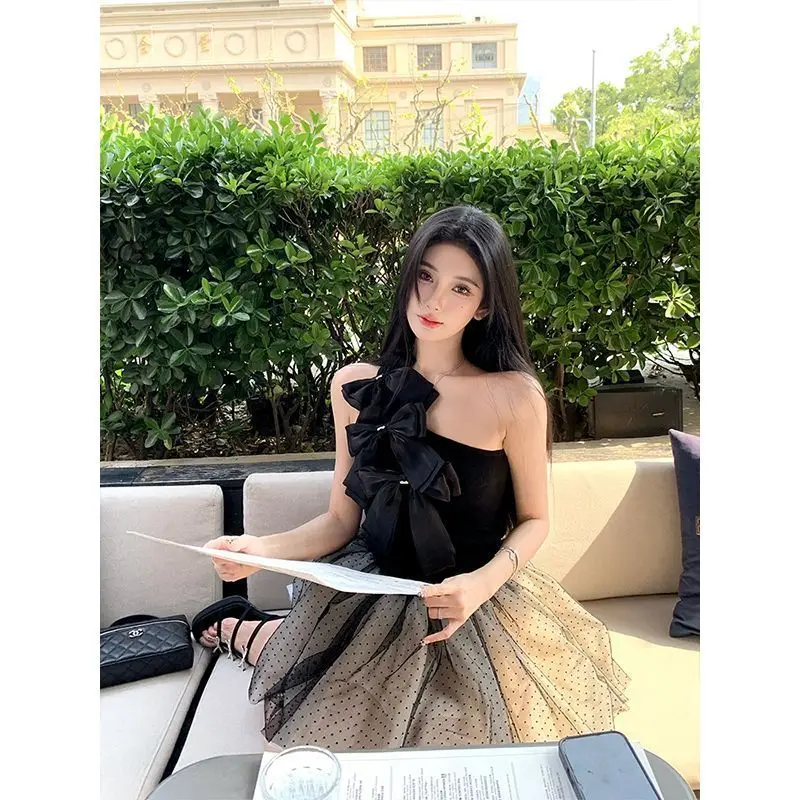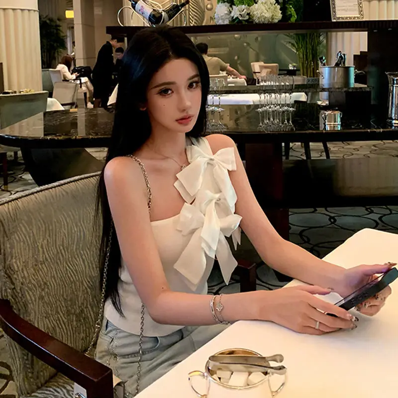 黒の弓オフショルダーホルターベスト女性の夏の甘いセクシーなシンプルなトップス Mujer 2025 新しいスリムフィットノースリーブタンクトップ