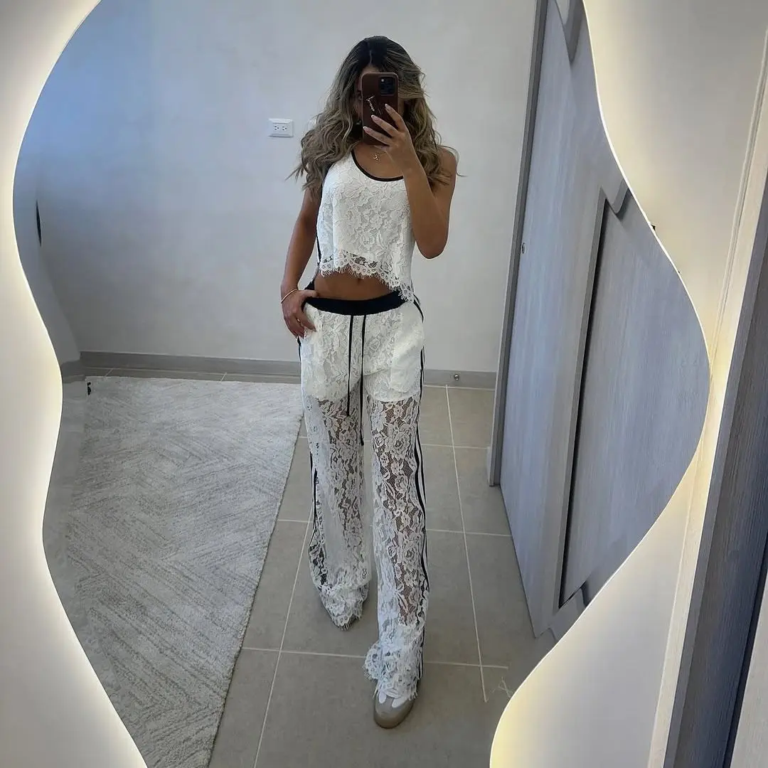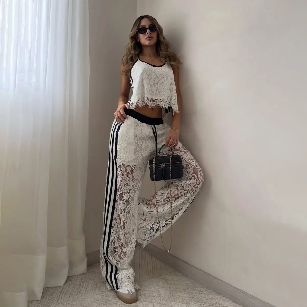 骨格ストレート 配色レース ツーピース セット(ストレートパンツ)
