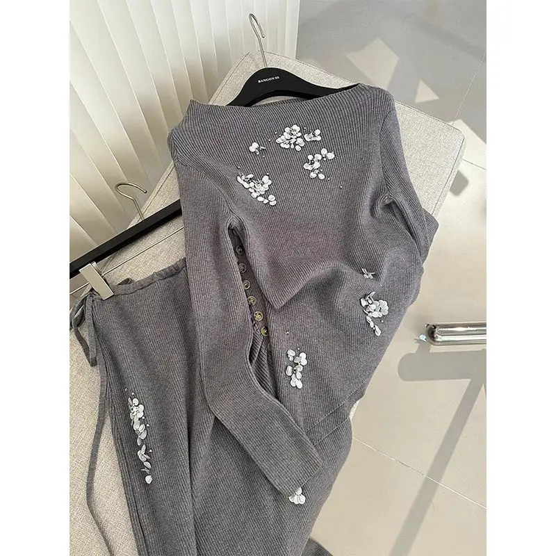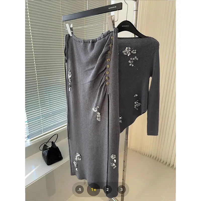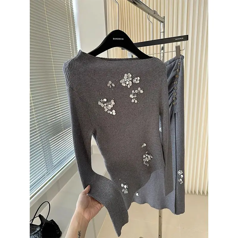 骨格ストレート スパンコール ニット&ミディスカート セット