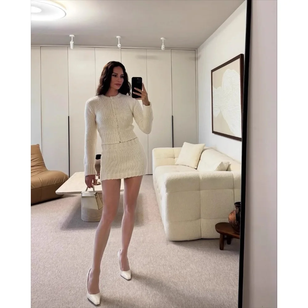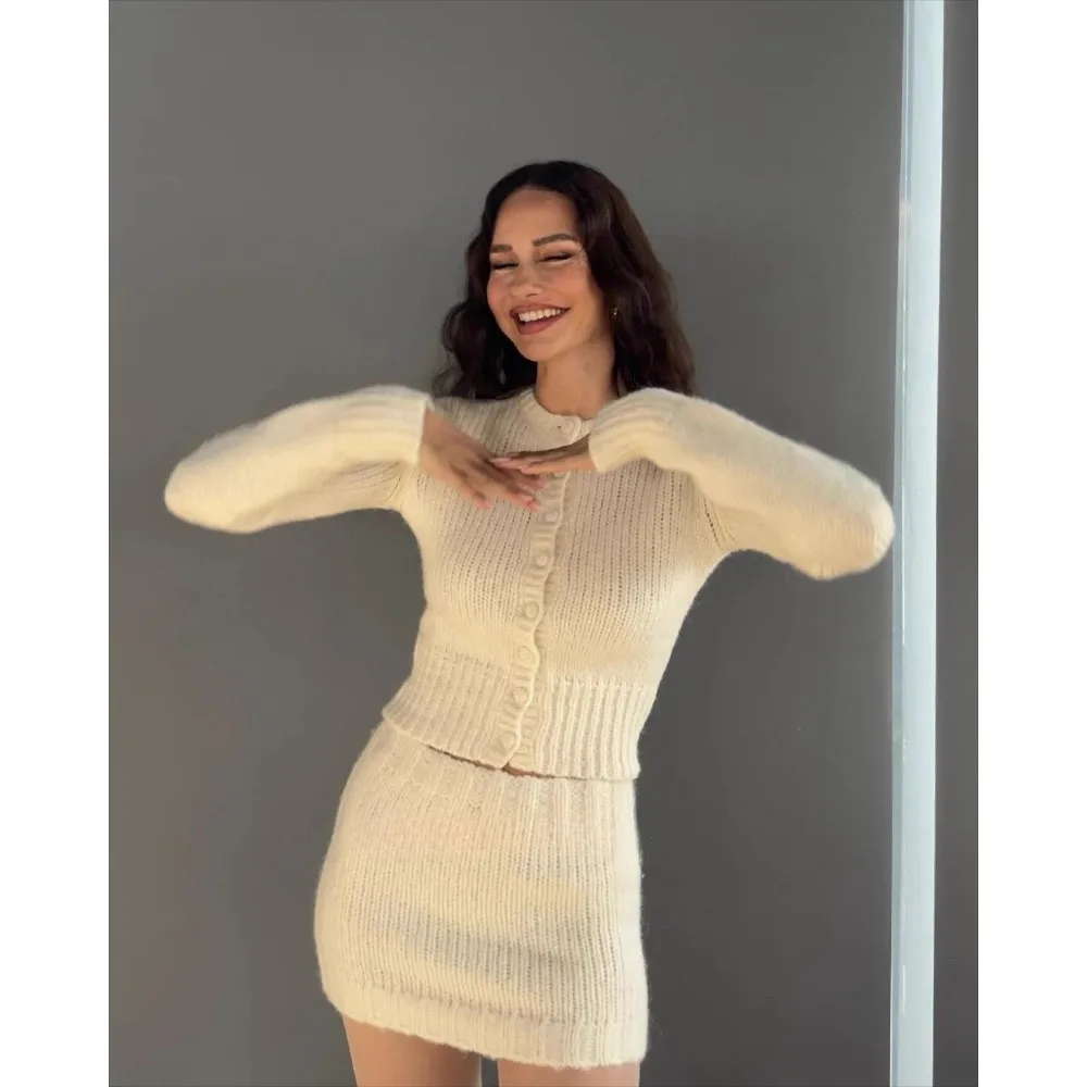 レトロでファッショナブル、高級感のあるウエストを包み込むスリムなウールニットカーディガンとヒップスカートのセットアップ