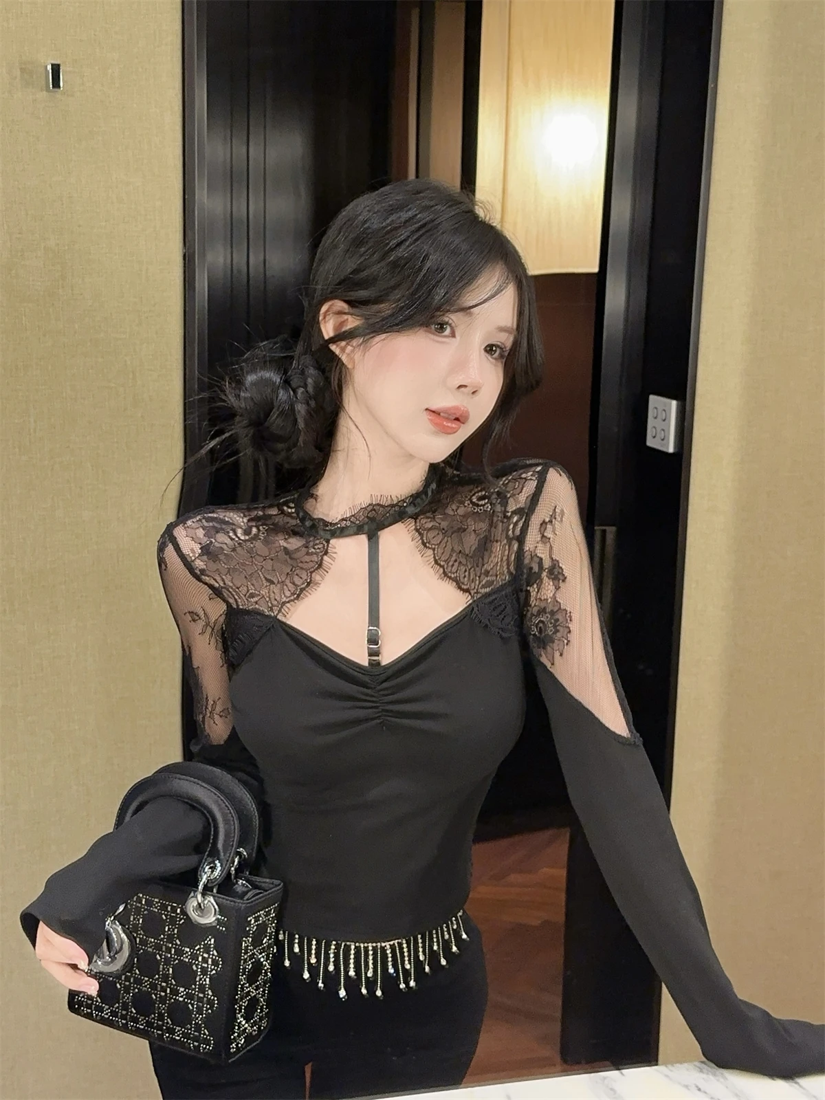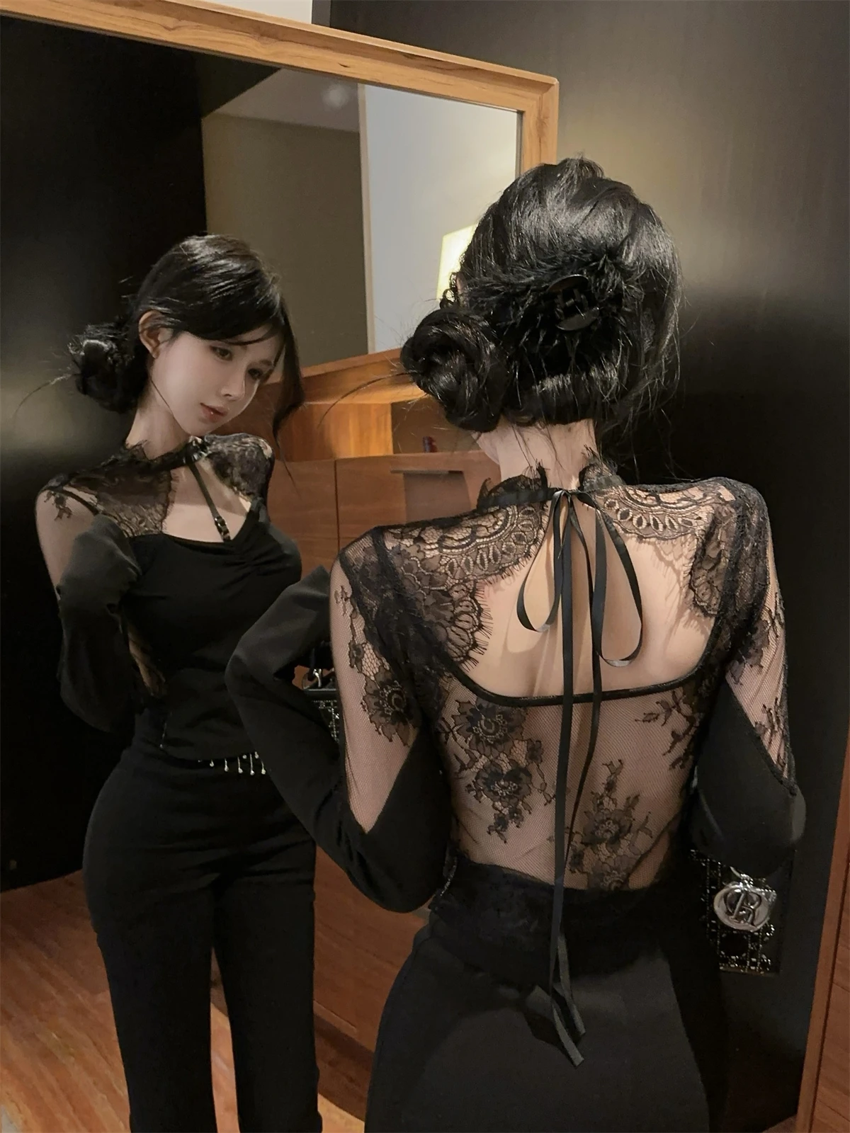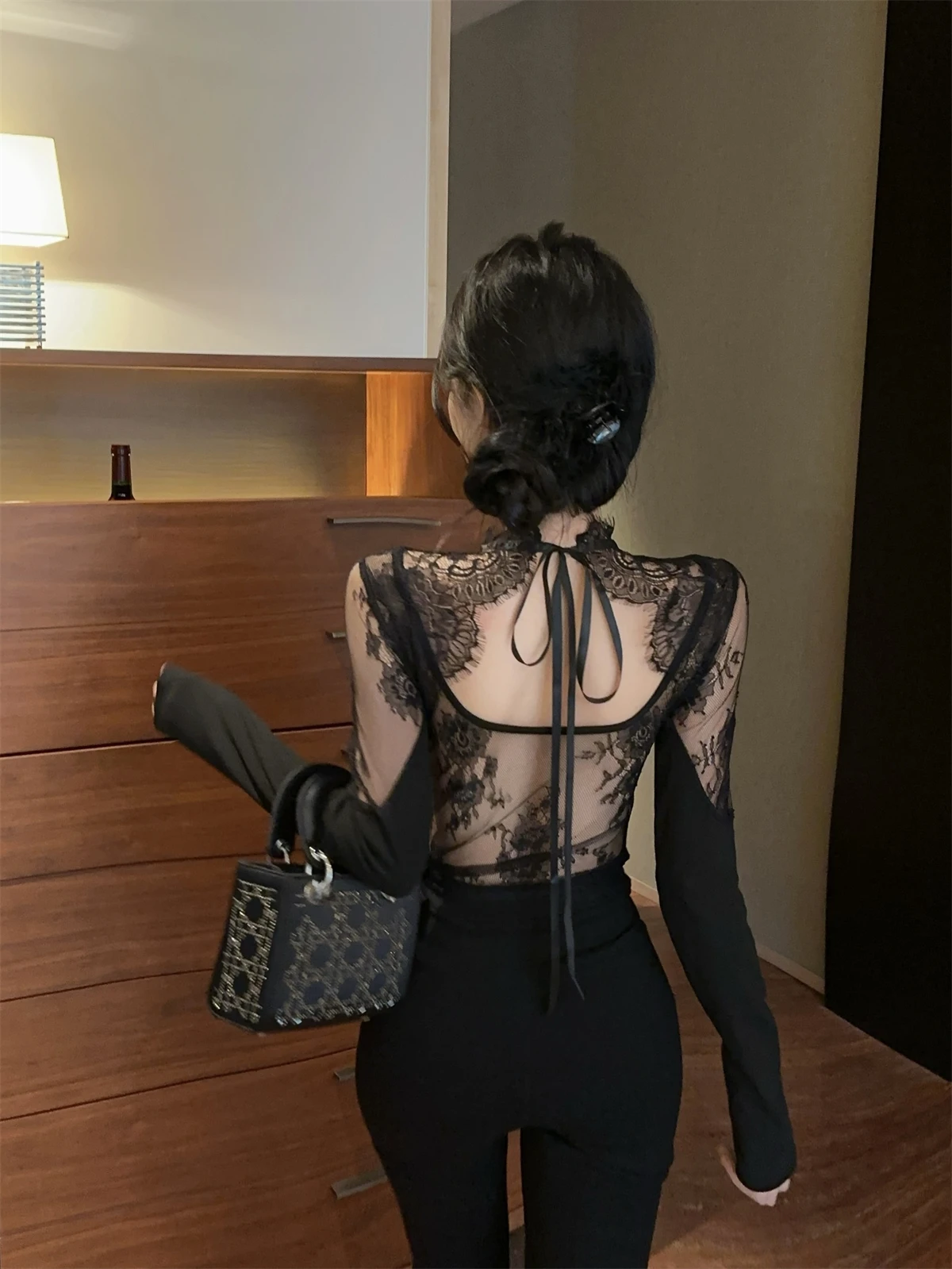 春秋長袖中空アウトバックレス Tシャツセクシーな女性トップスパッチワーク蝶ネクタイ黒レースシャツ