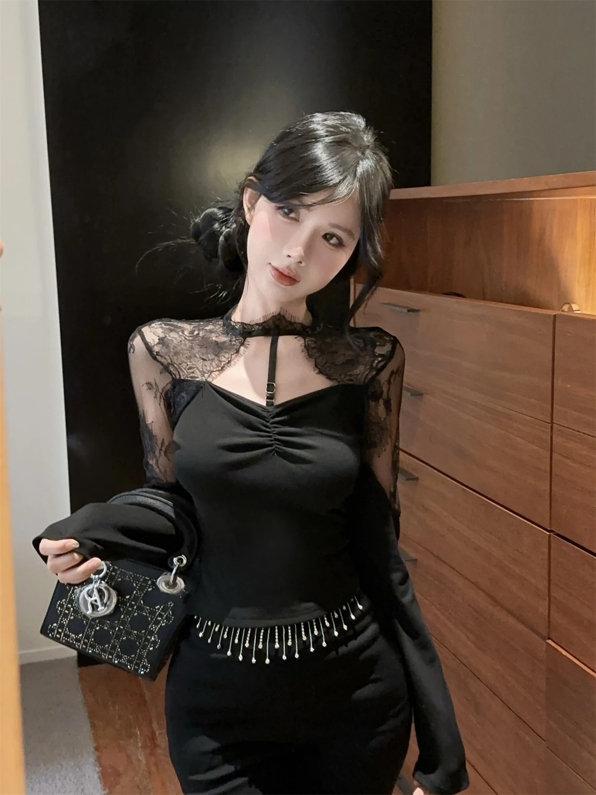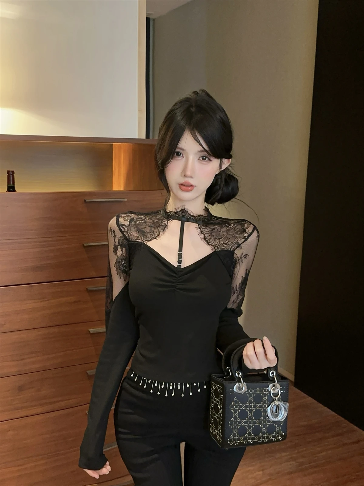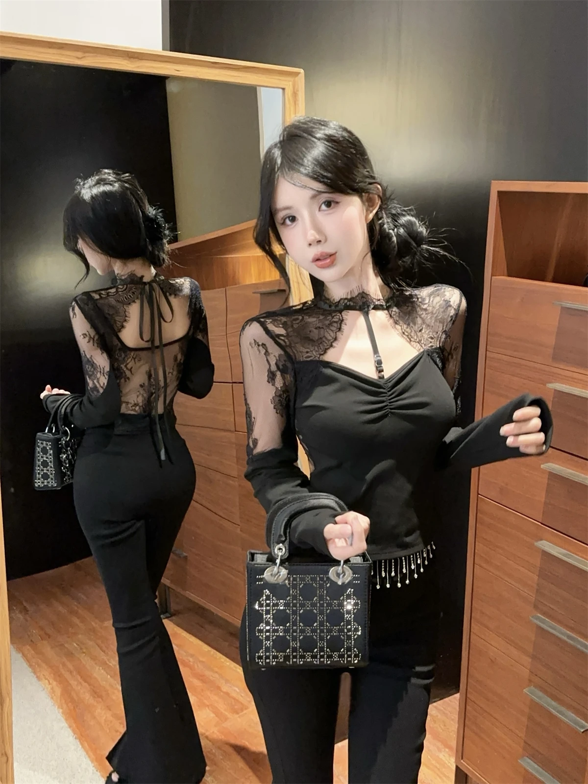 春秋長袖中空アウトバックレス Tシャツセクシーな女性トップスパッチワーク蝶ネクタイ黒レースシャツ