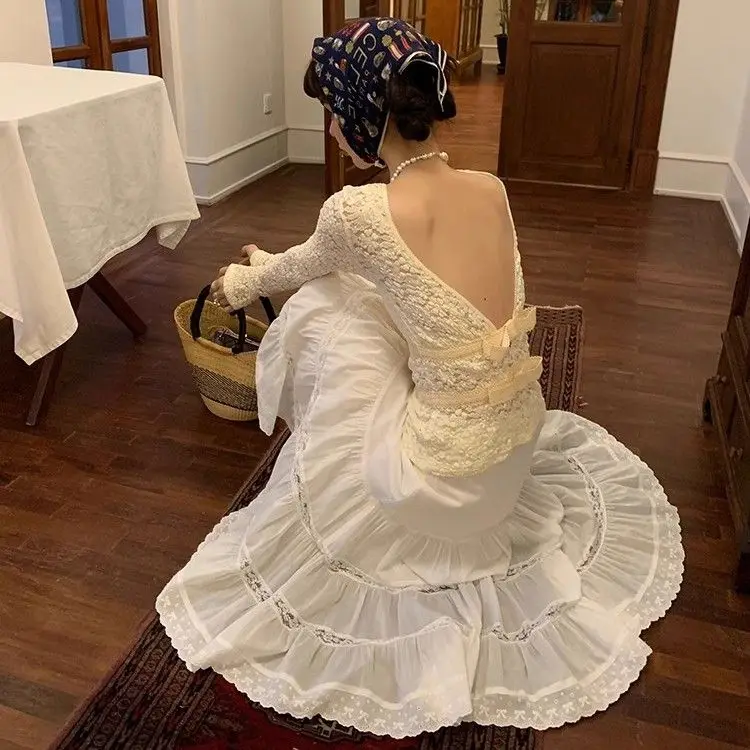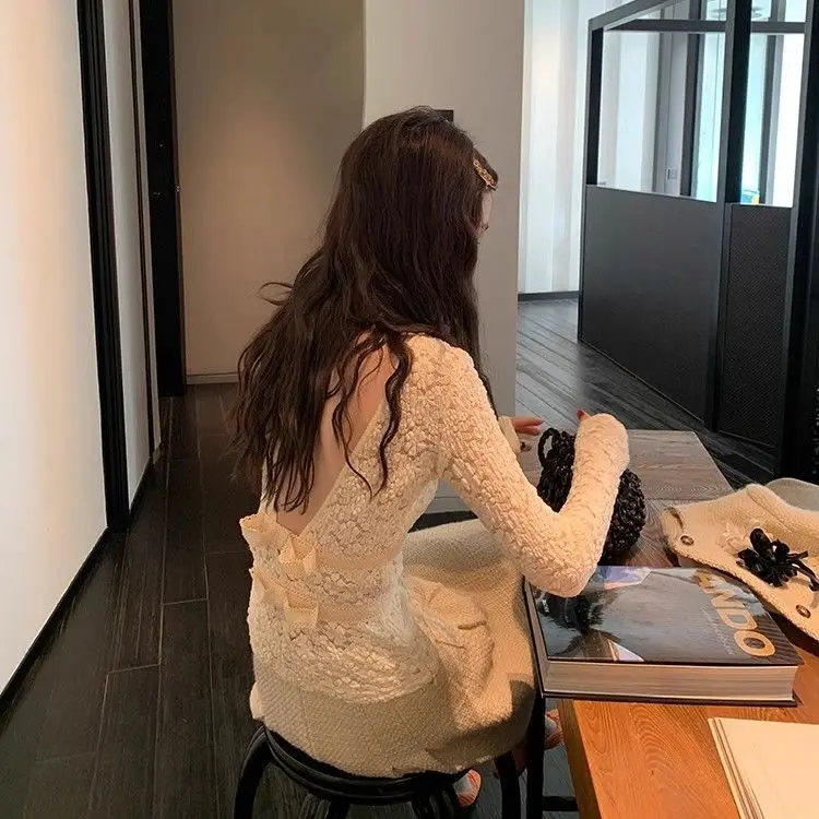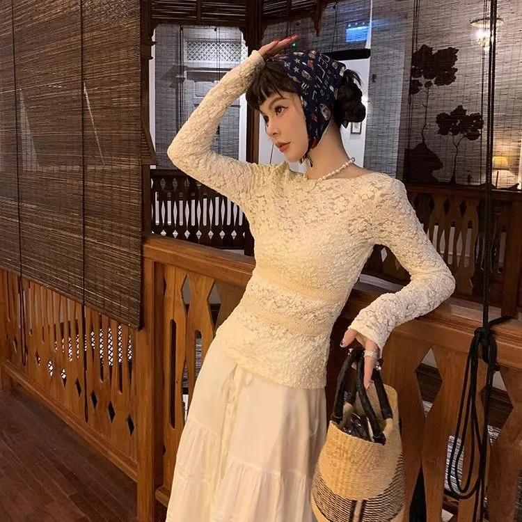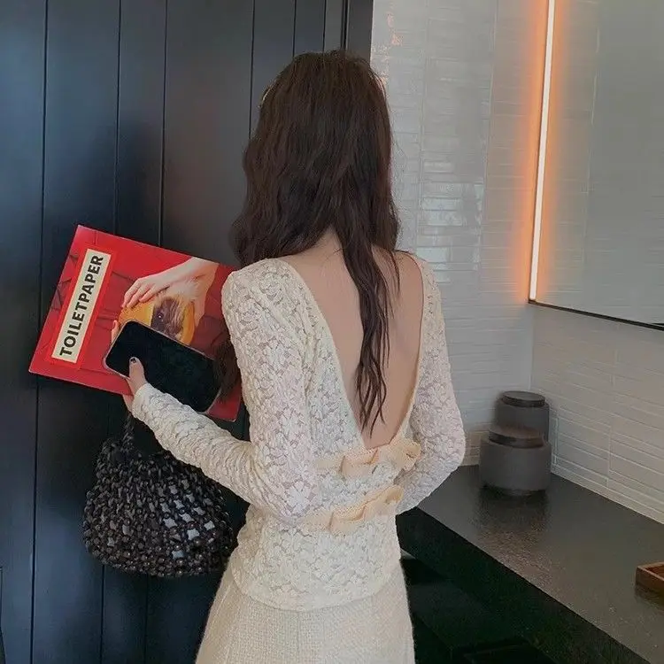 女性のための透明なレースのジャカードシャツ,裸の背中,長袖トップ,セクシー,痩身,甘い,シック,ベージュ,春