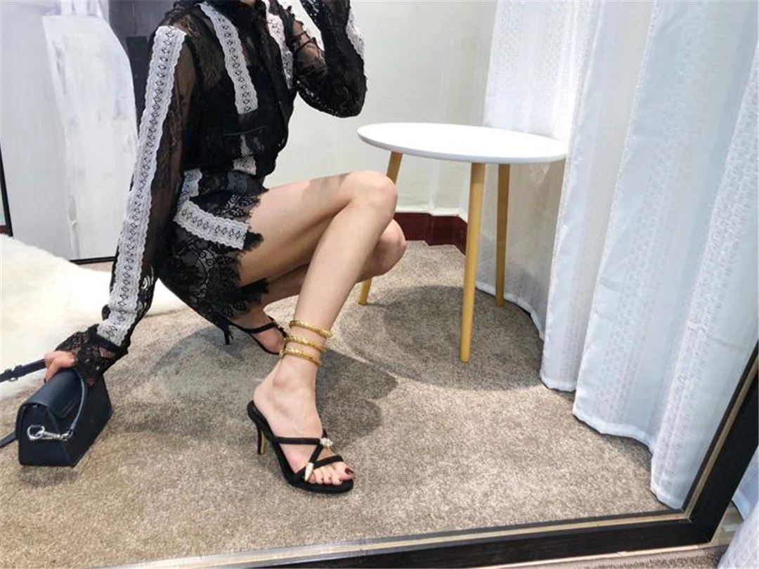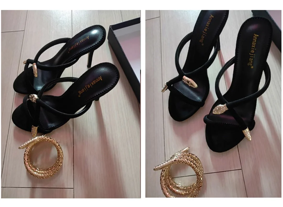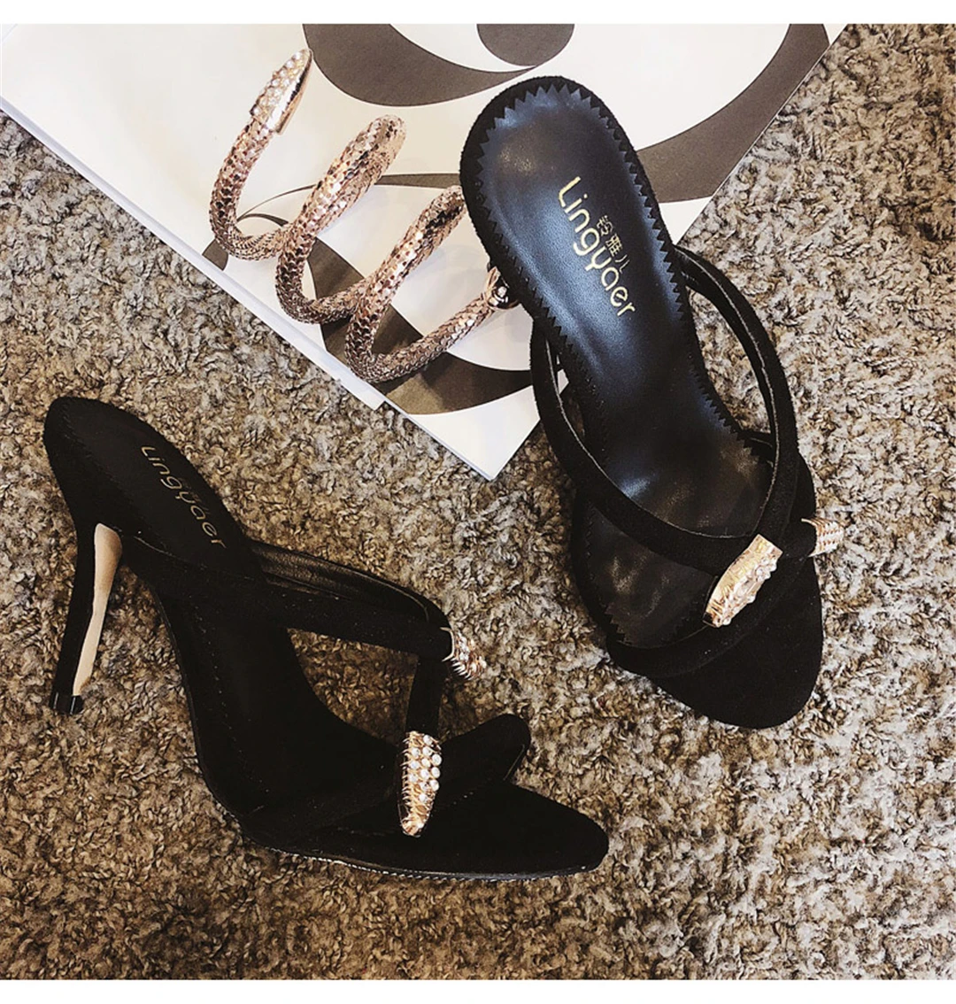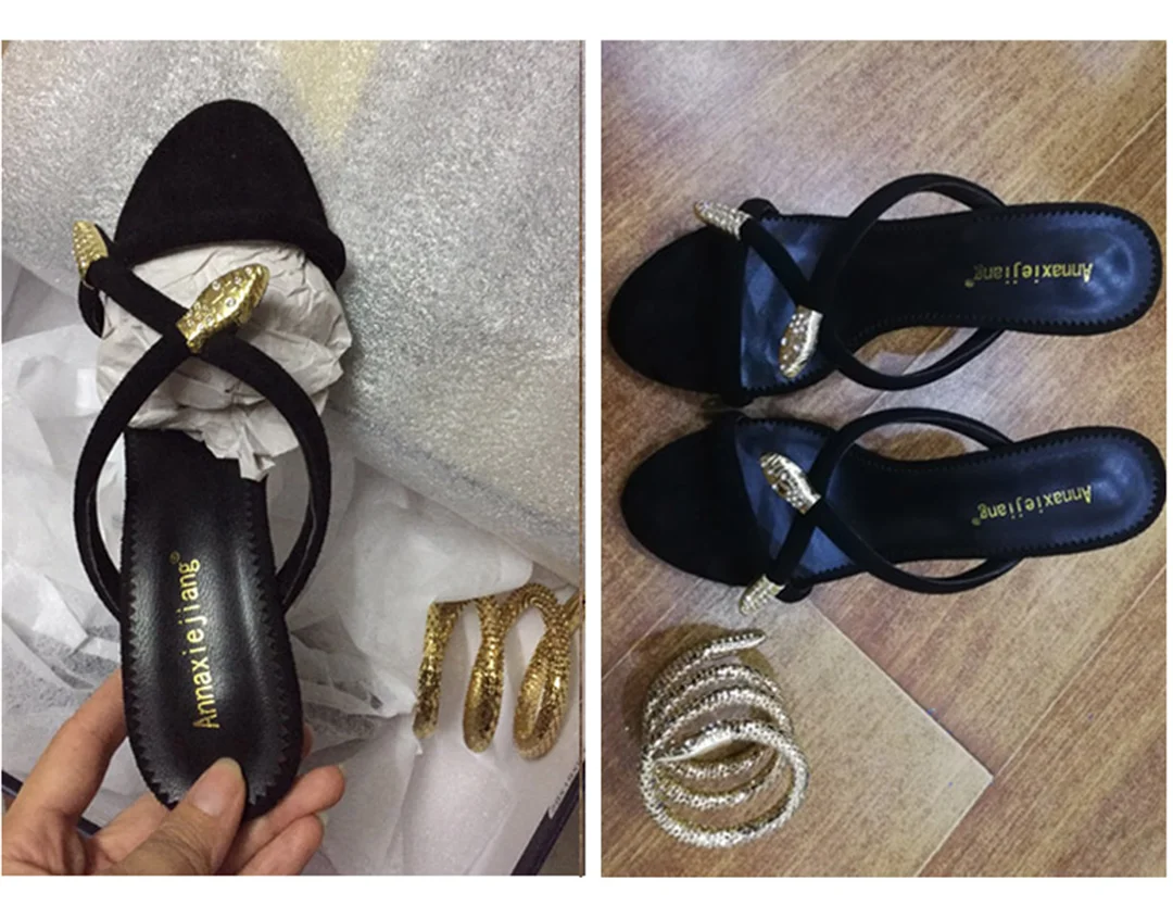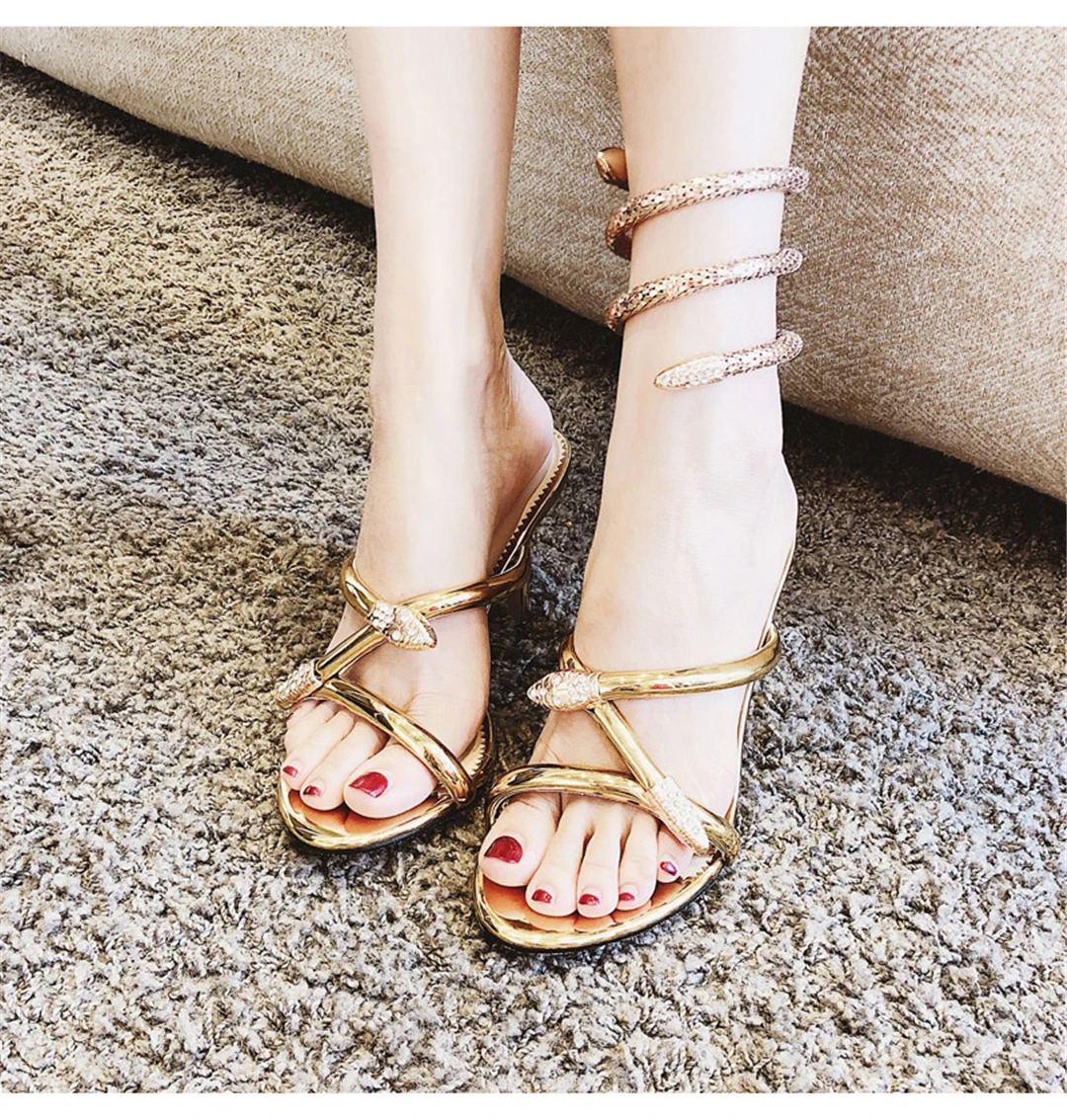 夏の新スエードパテントレザー金属ヘビ形ラップセクシーなファッションスリッパ薄型ハイヒール宴会ドレス女性のサンダル