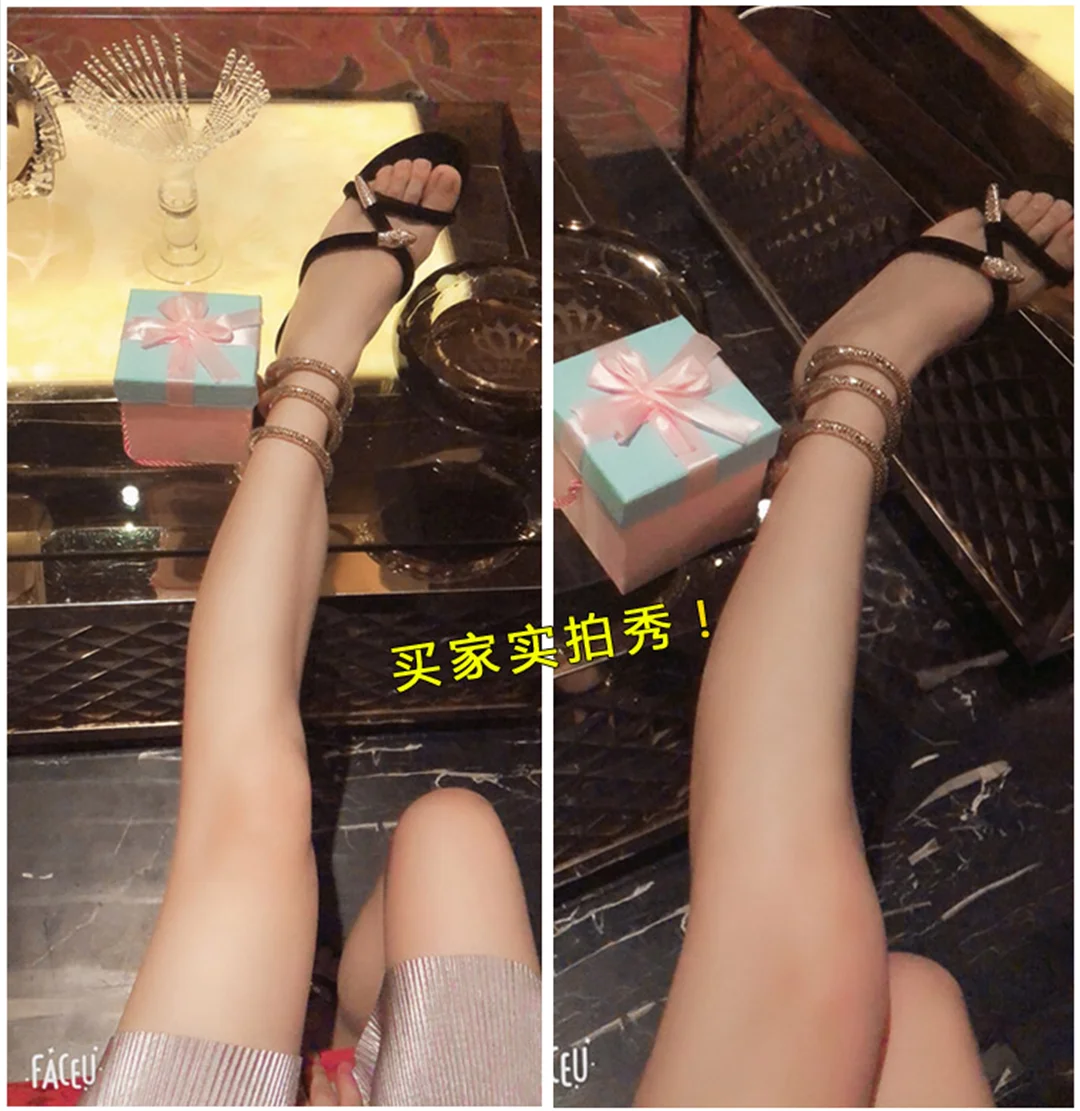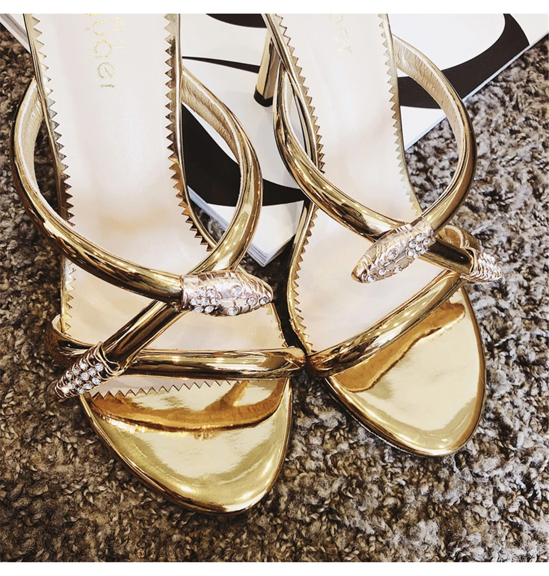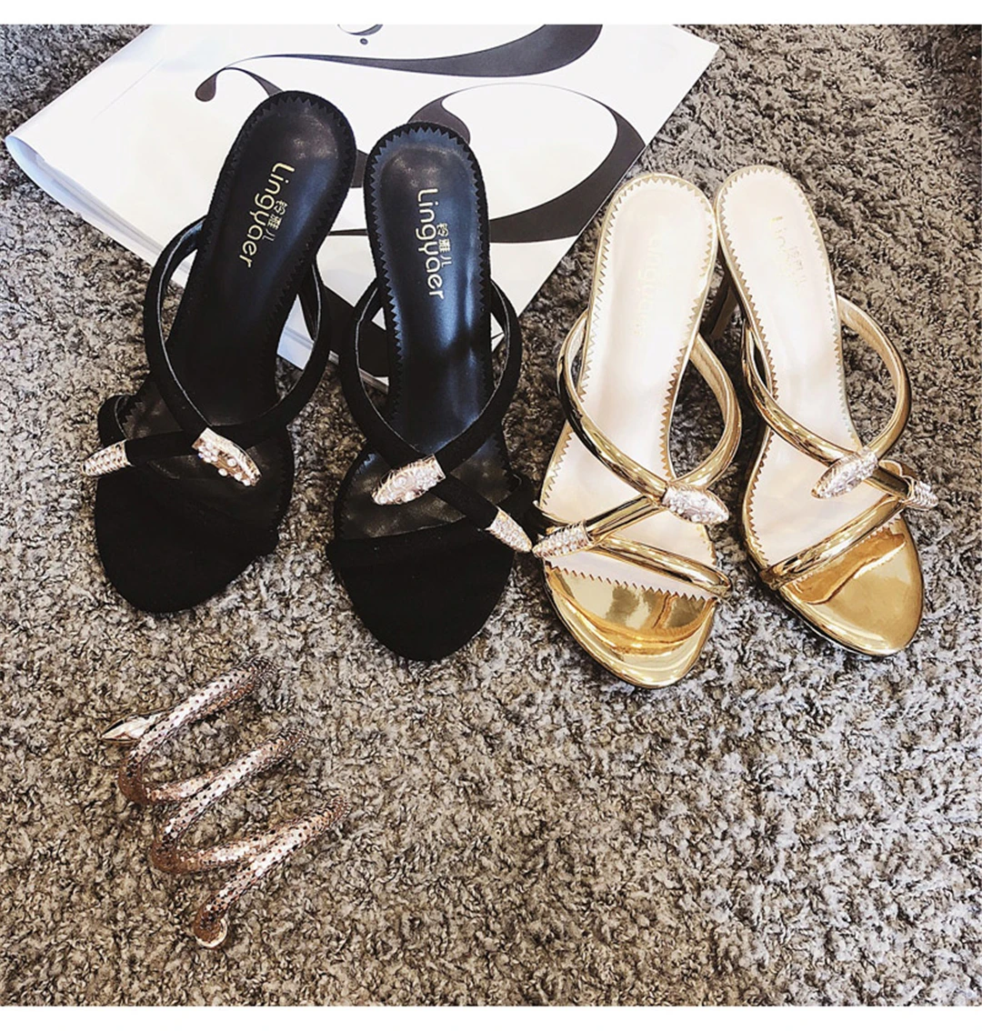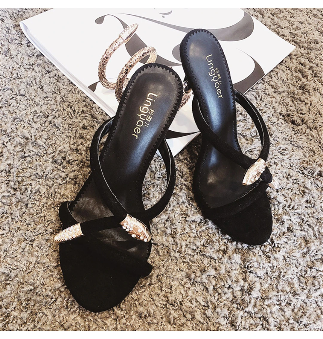 夏の新スエードパテントレザー金属ヘビ形ラップセクシーなファッションスリッパ薄型ハイヒール宴会ドレス女性のサンダル
