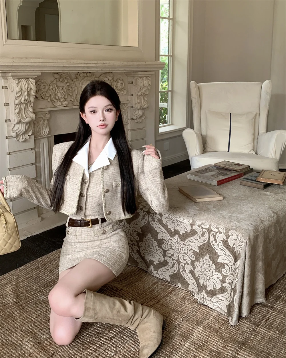 女性の長袖ツイード衣装、ノースリーブドレス、ノットカラー、女性の服、ショートコート、甘い女の子、秋、冬、2ピースセット