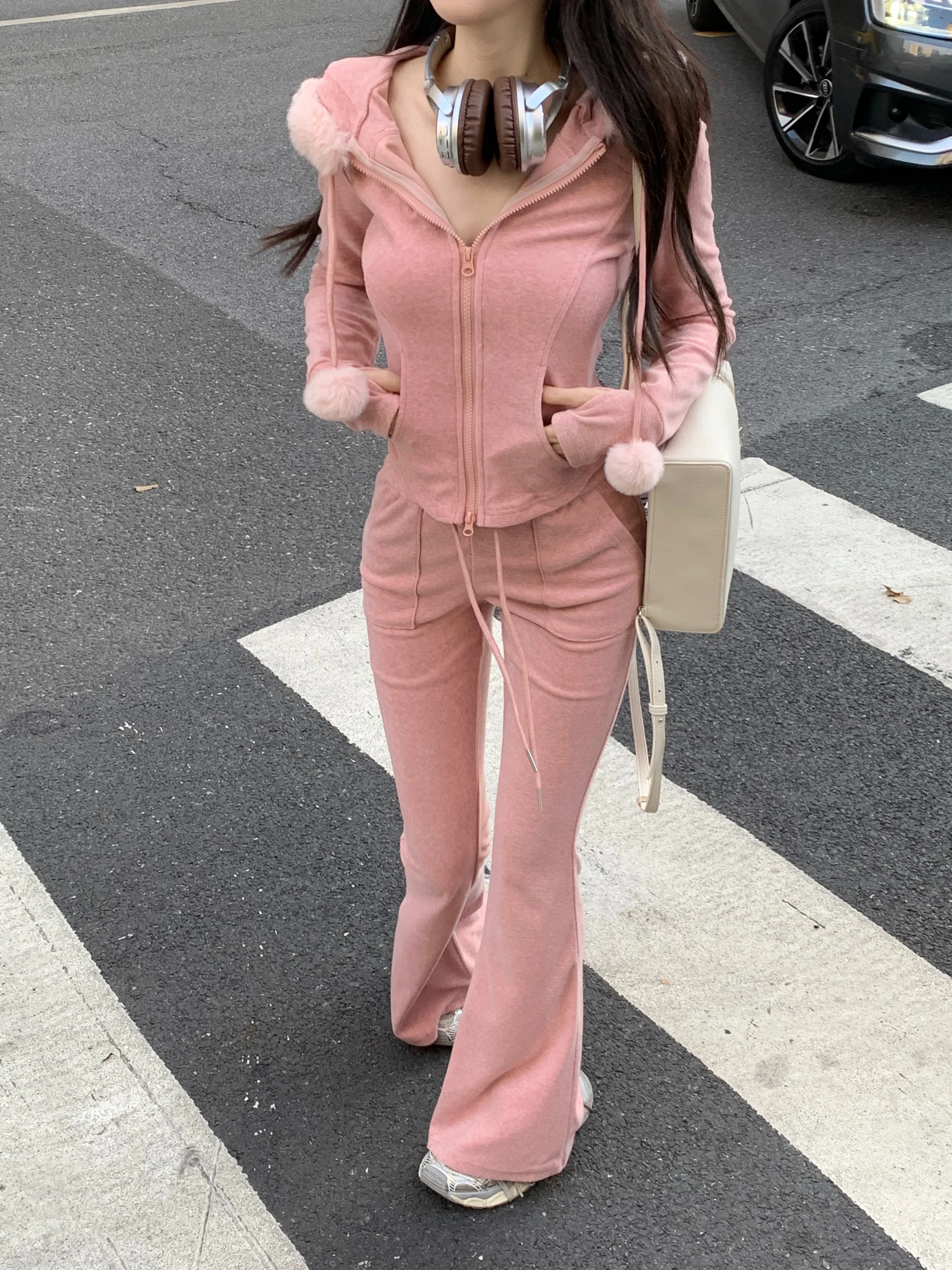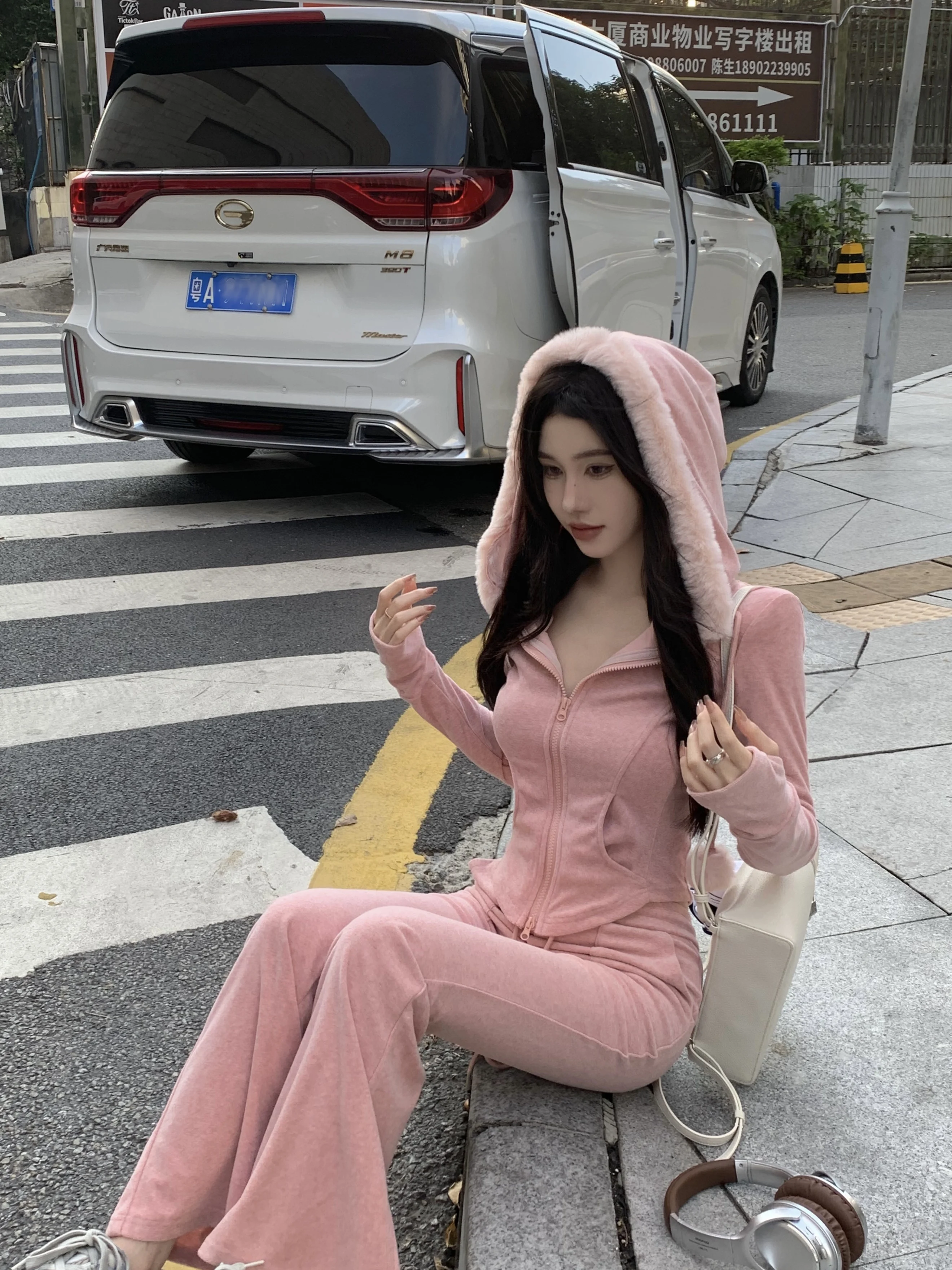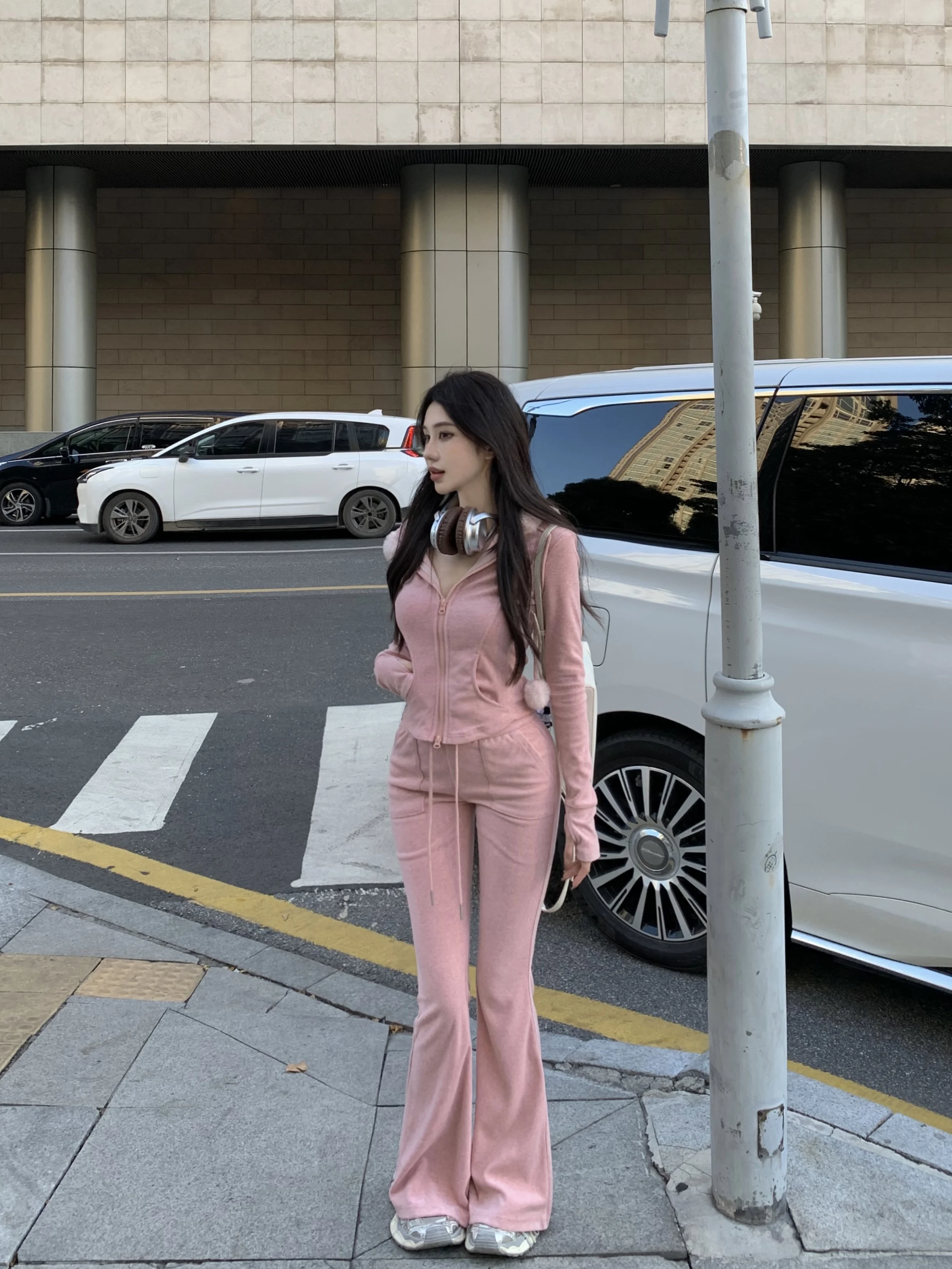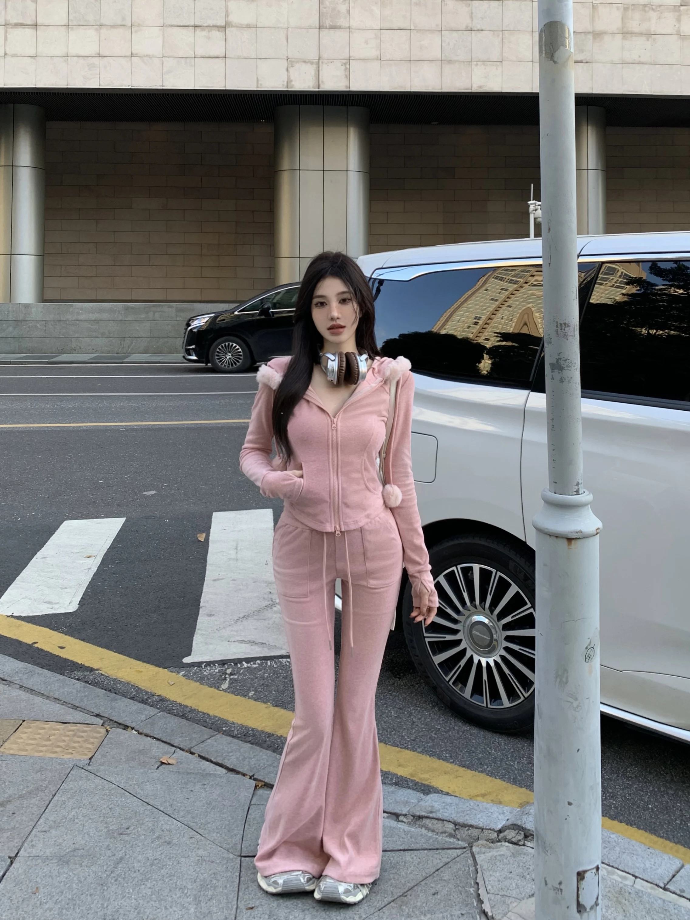甘いホットガールカジュアルスポーツスーツ女性の秋/冬ピンク豪華なフード付きコートフレアパンツツーピースセットファッション女性服
