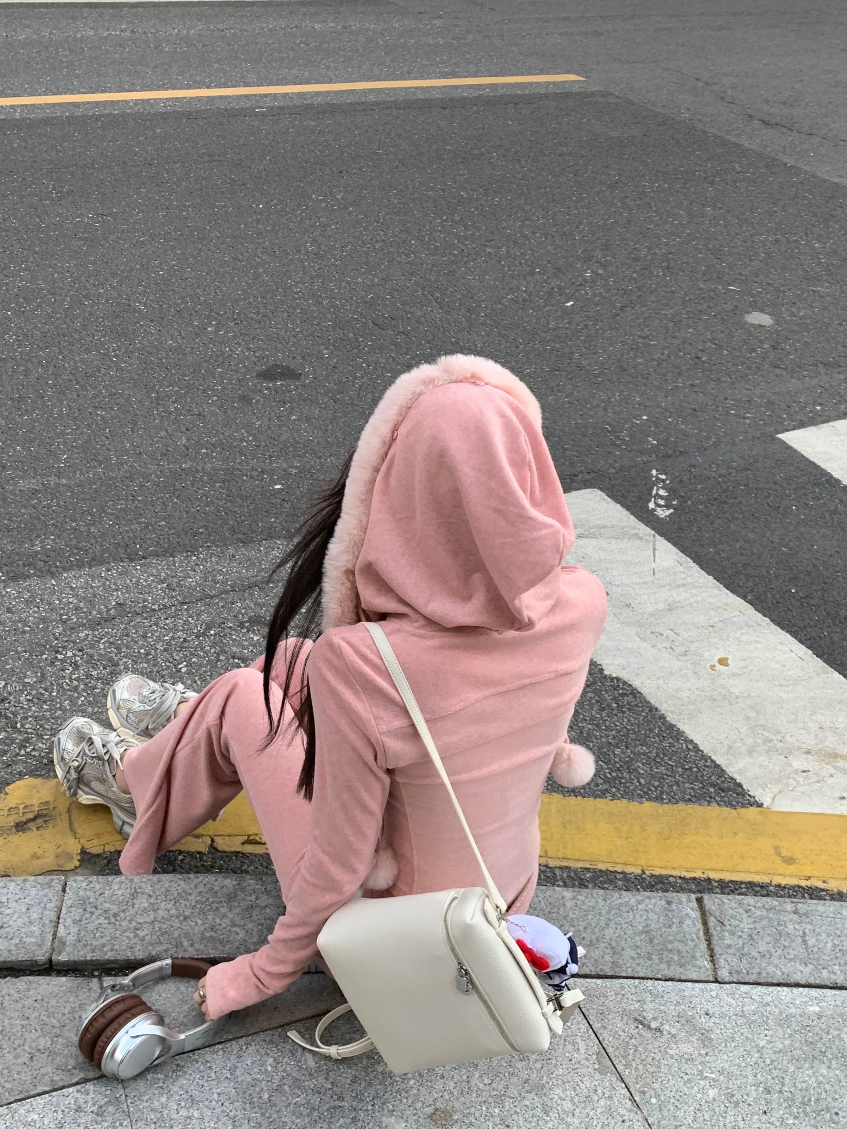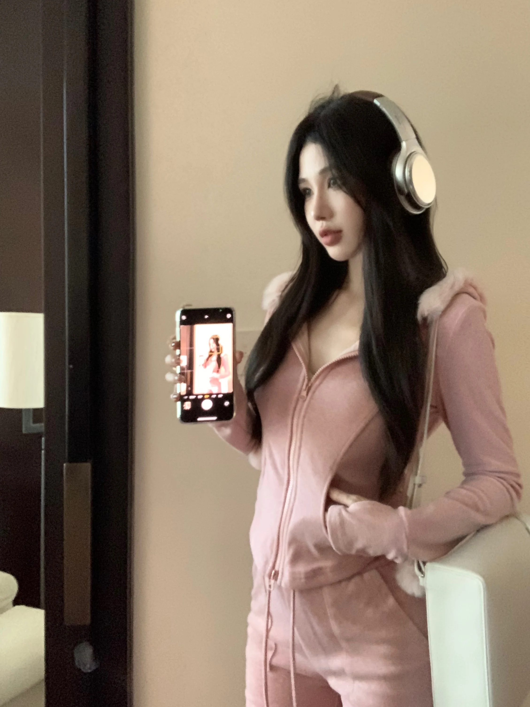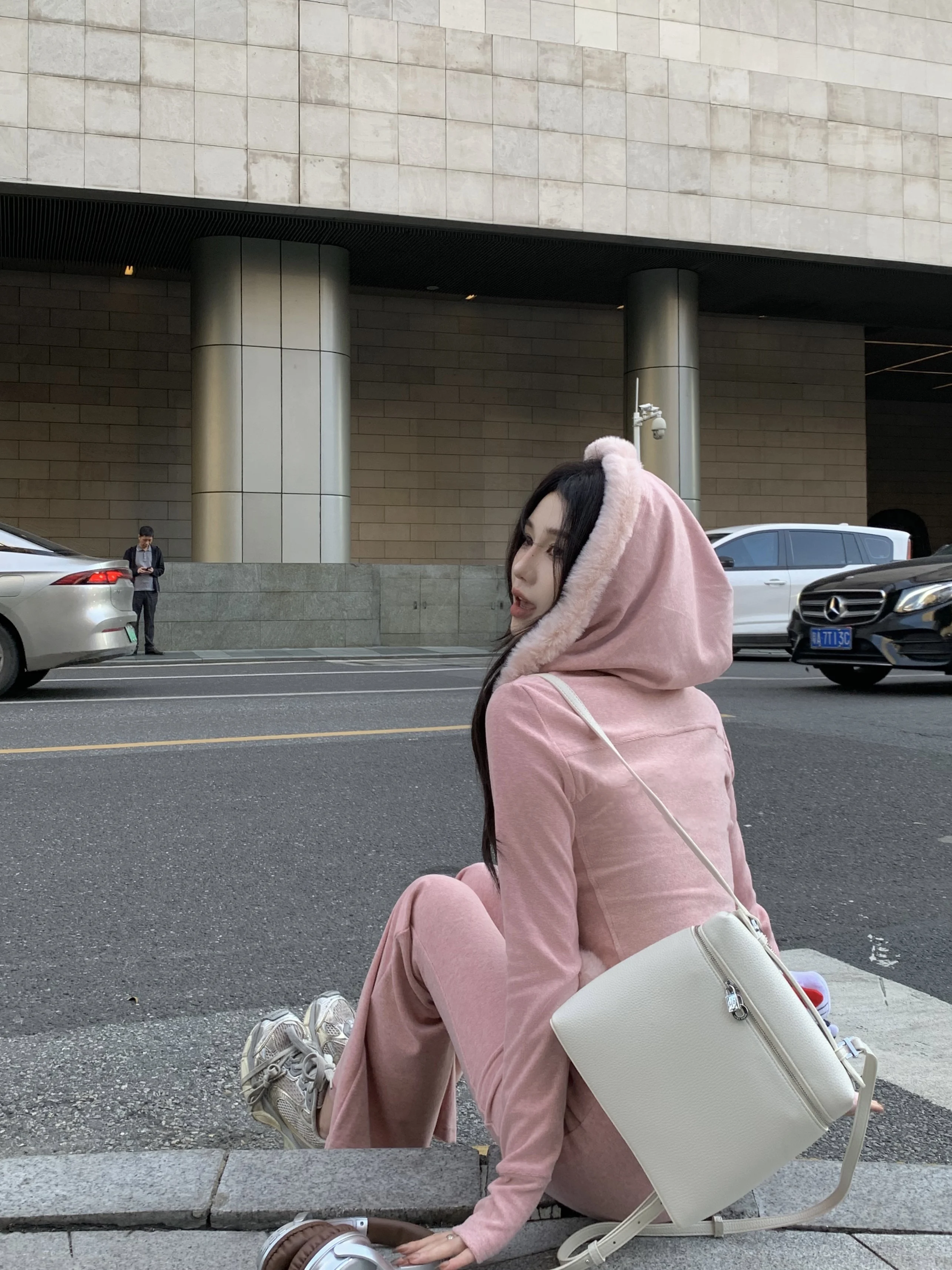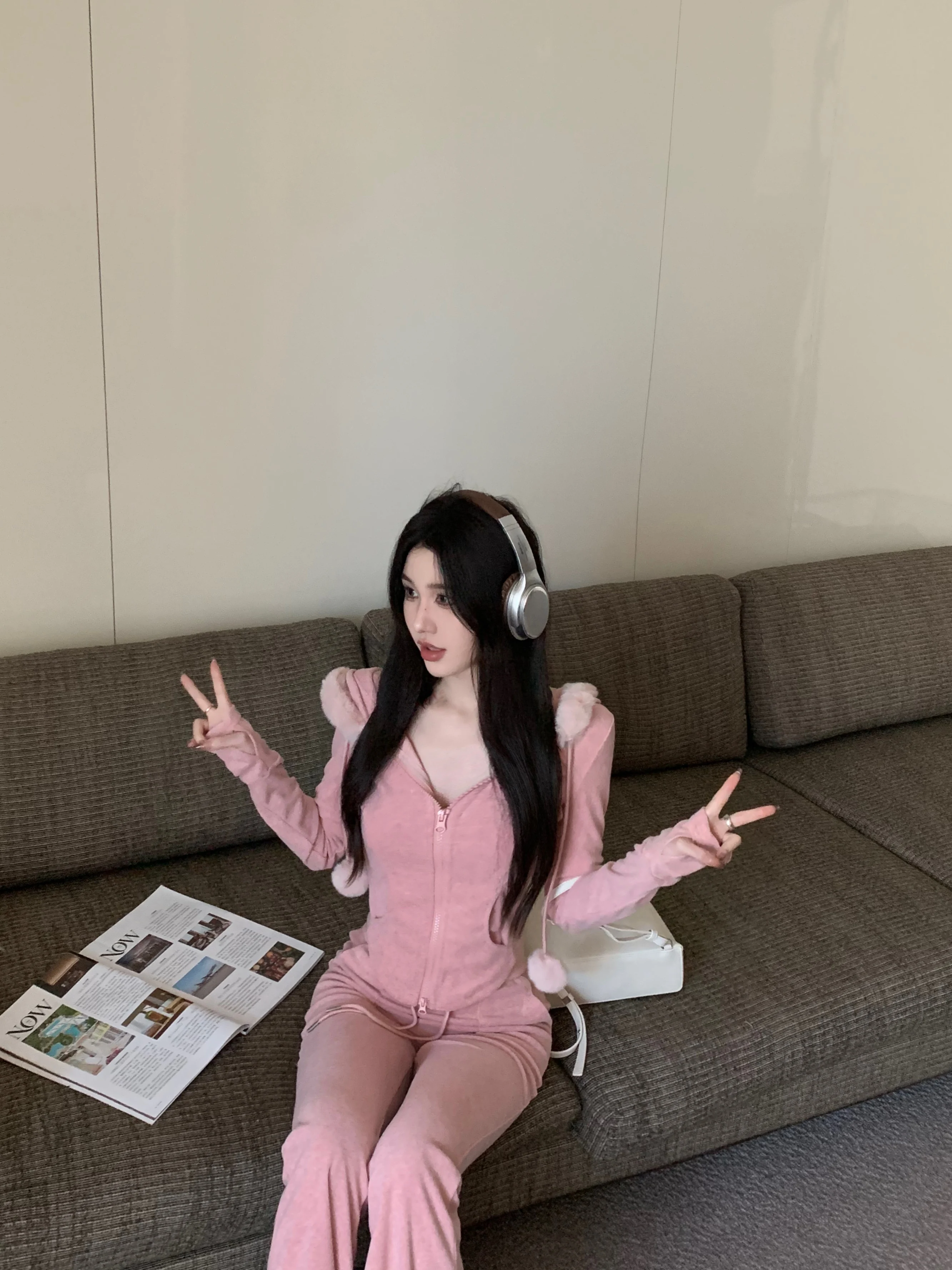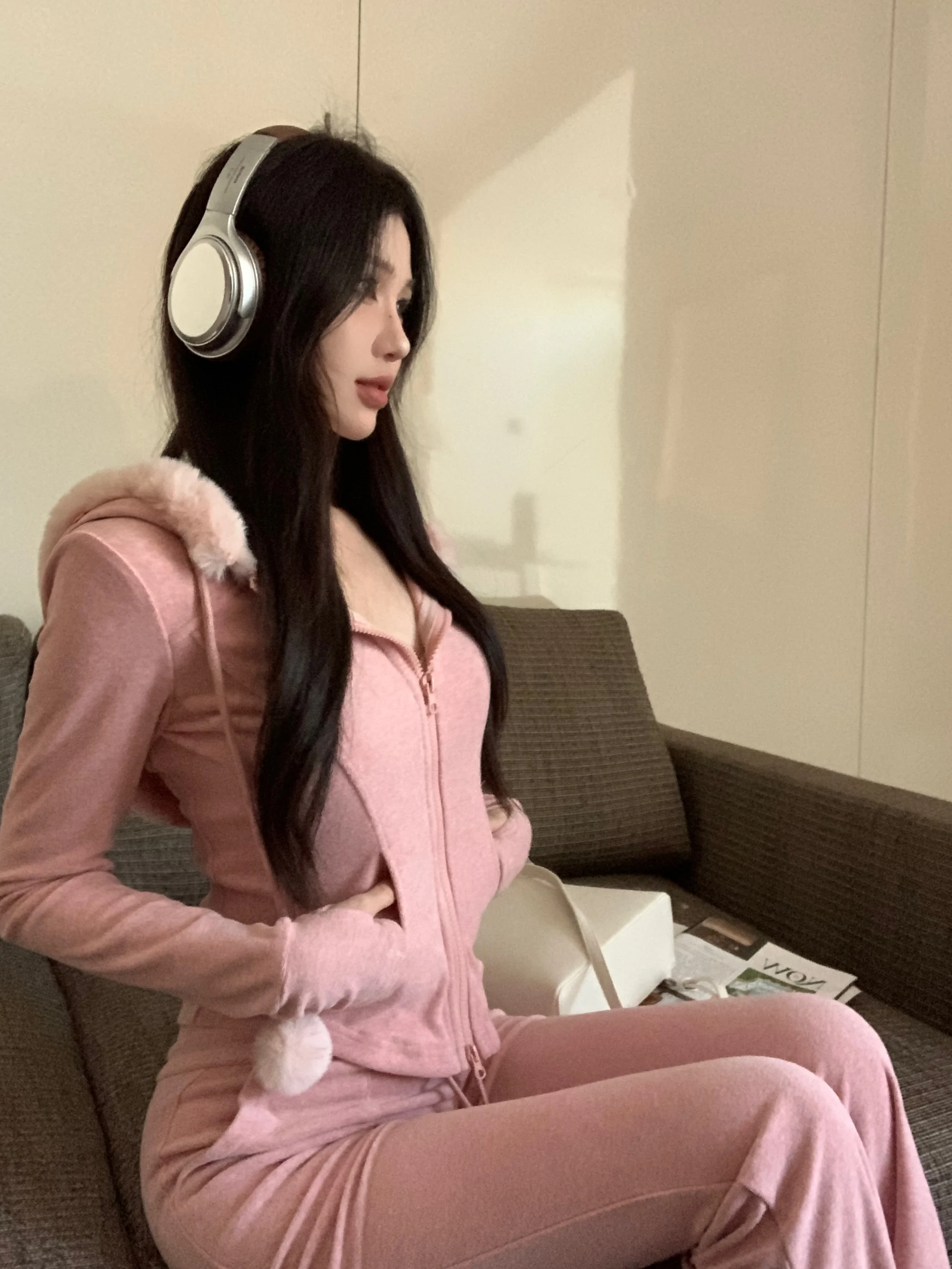 甘いホットガールカジュアルスポーツスーツ女性の秋/冬ピンク豪華なフード付きコートフレアパンツツーピースセットファッション女性服