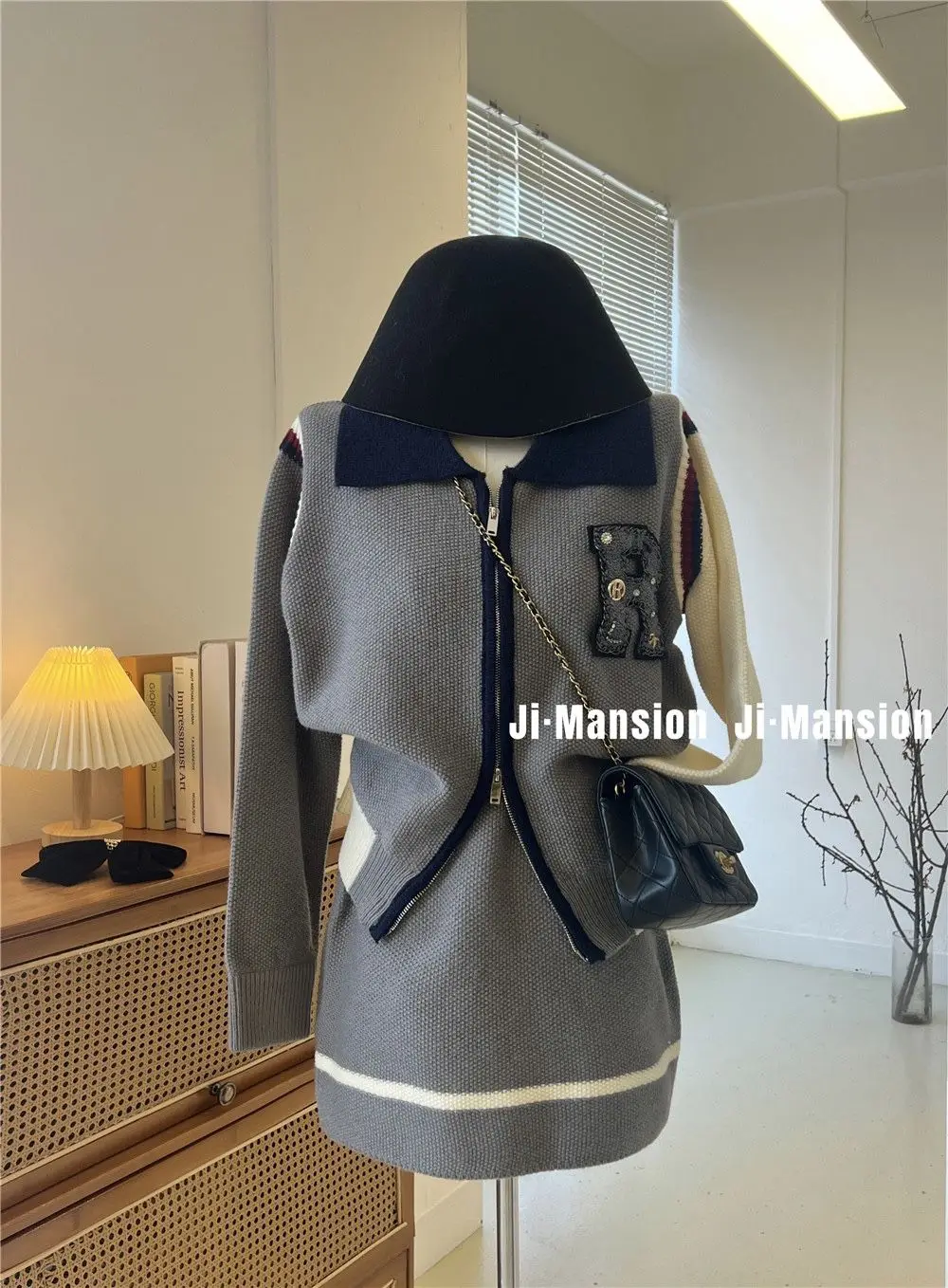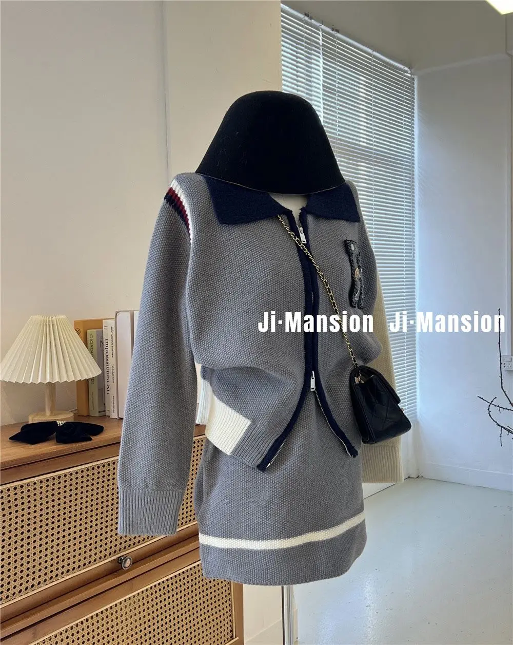 女性用ニットカーディガンコートとミニスカートのセット,ポロカラー,ハイウエスト,韓国ファッション,冬,新作,2点セット