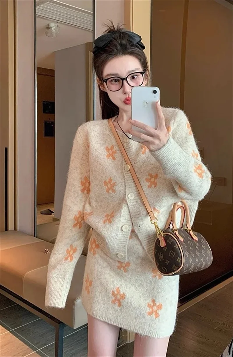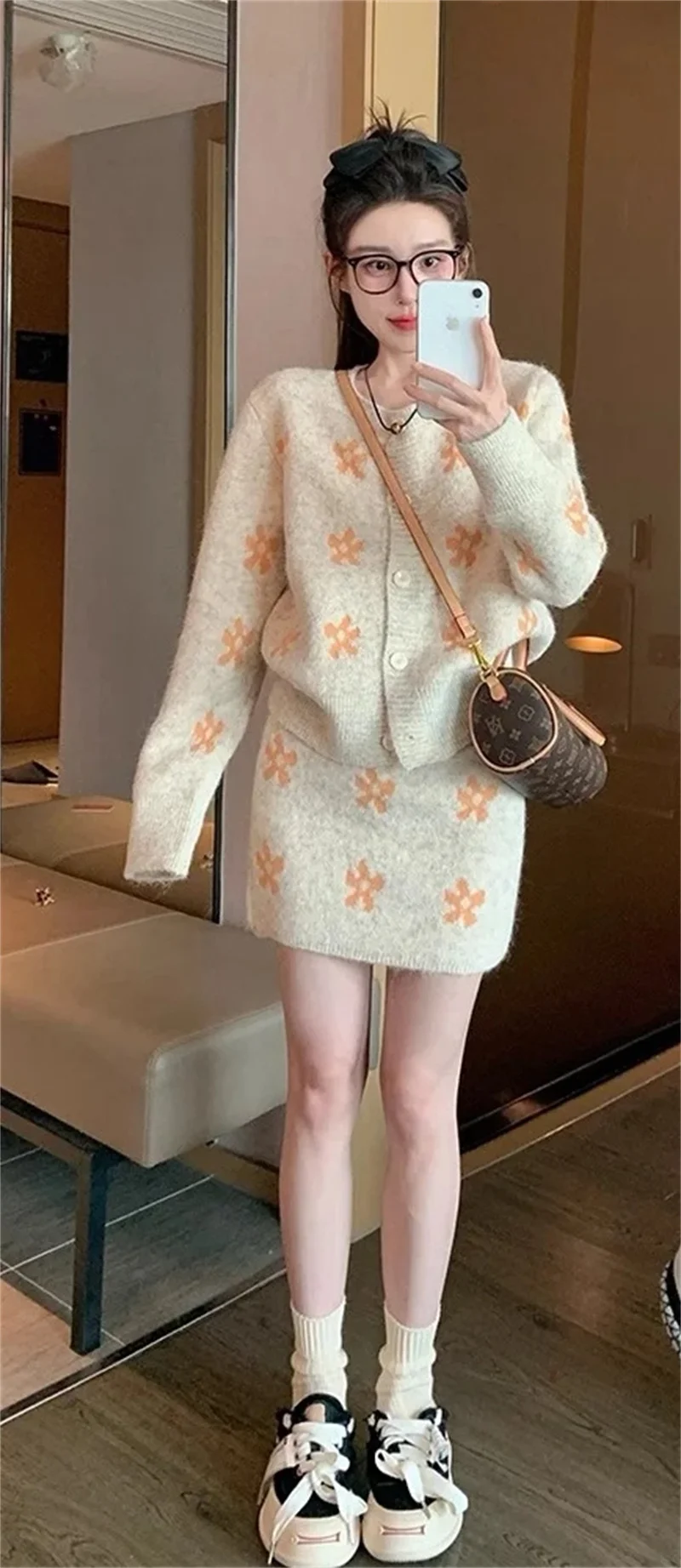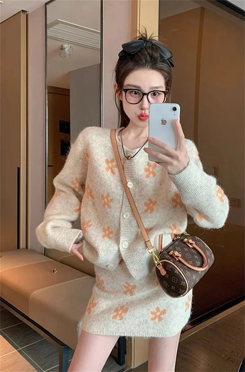 レディースセット 2025 秋新作 ジャカード長袖カーディガン ニットコート ミニスカートセット カジュアルファッション 可愛い 個性的
